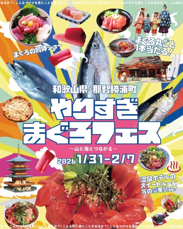 【「やりすぎまぐろフェス」開催のお知らせ】 一般社団法人那智勝浦観光機構は、那智勝浦ならではの自然・食・文化の魅力を広く発信することを目的としたイベントを開催いたしますのでお知らせします。本イベントは、まぐろをきっかけに町を歩き、食べ、体... -