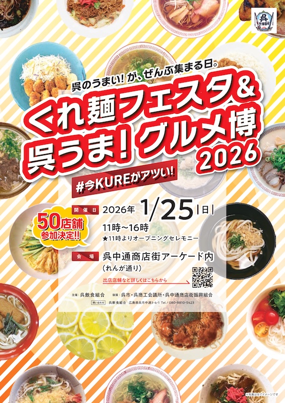 2026年1月25日(日)呉で話題の麺類やグルメを中心に近隣エリアの麺類やグルメが呉市れんが通りに約50店舗集まります! 呉飲食組合が地域を盛り上げようと、初開催。呉市のれんが通りのアーケードを特設会場に約50店舗が賑わいます。呉市には創業から何十... -