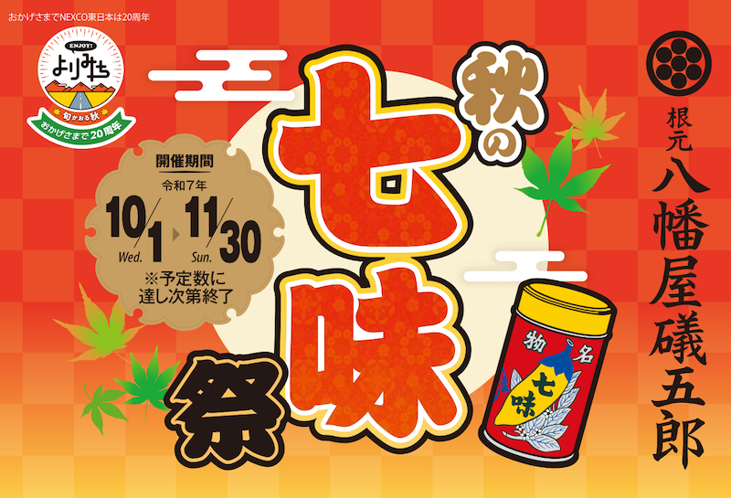 【~直営店限定の人気商品が高速道路限定オリジナルデザインで登場~】 株式会社ネクスコ東日本エリアトラクトは、株式会社八幡屋礒五郎とコラボレーションし、高速道路のサービスエリア・パーキングエリアで「秋の七味祭」を開催いたします。 昨年も多く... -