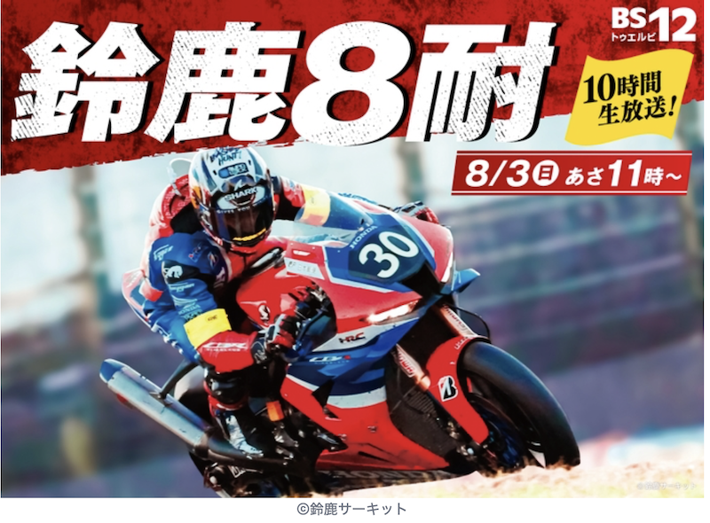 全国無料放送のBS12 トゥエルビは、2025年8月3日(日)に開催される「2025 FIM世界耐久選手権 “コカ・コーラ” 鈴鹿8時間耐久ロードレース 第46回大会」を生中継で放送いたします。今年もゲストとして高橋名人が登場する他、解説者&実況者が決定したためお... -