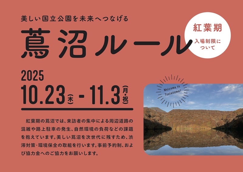 紅葉期の蔦沼周辺におけるオーバーツーリズム対策への協力のお願いとして、入場制限を実施いたします。