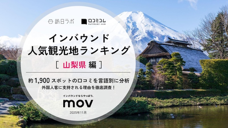 業界最大級のインバウンドビジネスメディア「訪日ラボ」及び 店舗向け集客一元化プラットフォーム「口コミコム」を運営する株式会社movは、山梨県の観光地に寄せられた最新の口コミデータから、独自の『インバウンド人気観光地ランキング』を発表しました... -