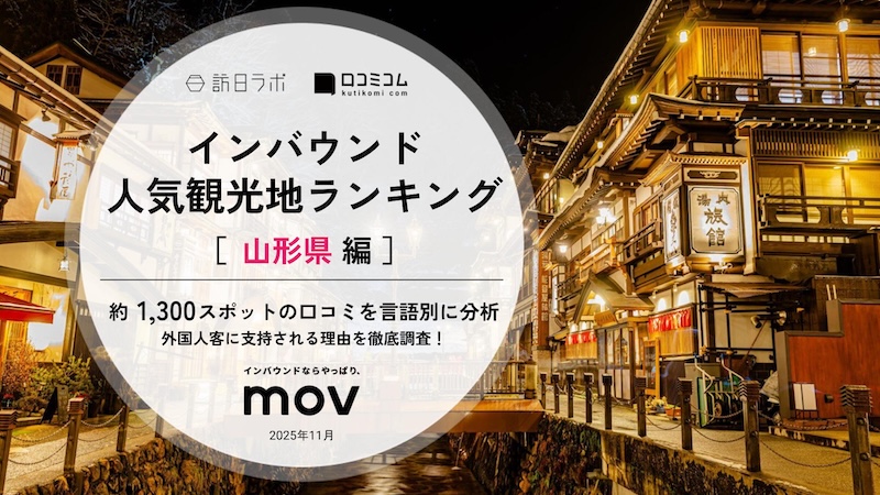 業界最大級のインバウンドビジネスメディア「訪日ラボ」及び 店舗向け集客一元化プラットフォーム「口コミコム」を運営する株式会社movは、山形の観光地に寄せられた最新の口コミデータから、独自の『インバウンド人気観光地ランキング』を発表しました。 ... -