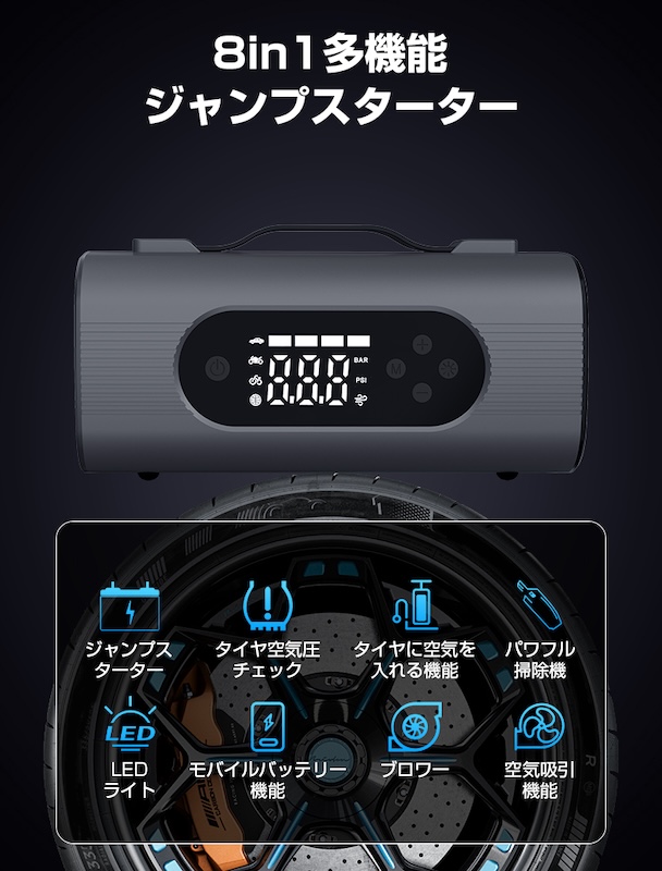 【緊急時にも安心!2000Aピーク電流の多機能ジャンプスターター新発売 - エンジンスターター LEDインジケータ付き掃除機/空気入れ/モバイル充電器としても使える8in1モデル】 クルマのトラブルからアウトドア、防災まで――これ一台。 L&Lライブリーラ... -