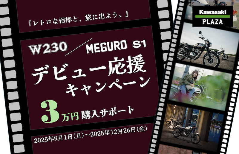 【W230/MEGURO S1の新車購入、デビューを応援!『レトロな相棒と、旅に出よう』】 株式会社カワサキモータースジャパンが、2025年9月1日(月)より、全国のカワサキプラザにおいて「W230」および「MEGURO S1」の新車(2025年モデル)のご購入時にご利用い...