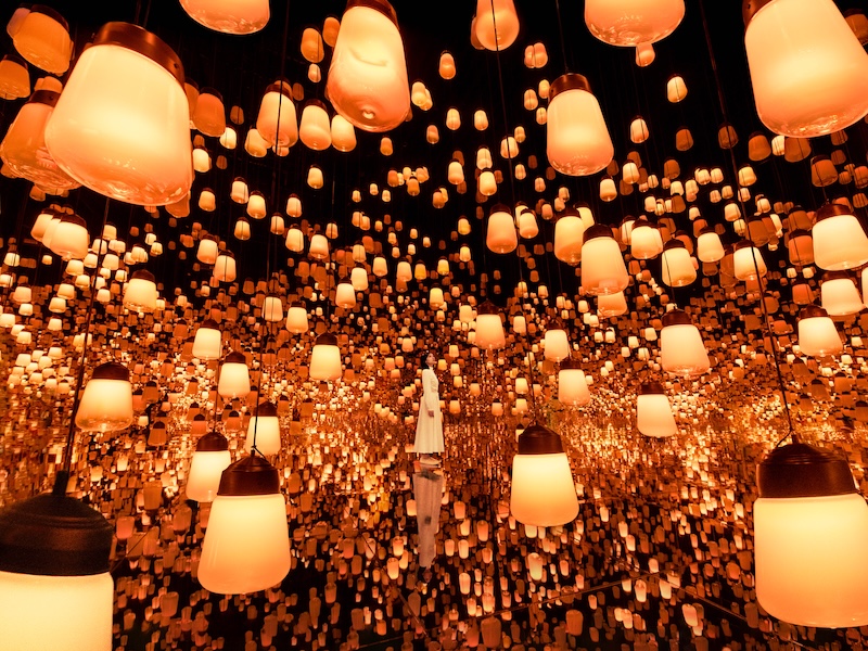 チームラボと殿堂入りサウナがコラボレーションした常設展「チームラボ 廃墟と遺跡:淋汗茶の湯」が、九州・御船山楽園で開催中。12月7日(日)まで、ランプの作品が秋の景色に。園内では紅葉まつりも開催