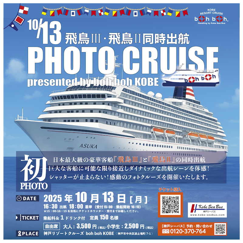 神戸シーバスboh boh KOBEは、10月13日(月・祝に)「飛鳥Ⅲ 飛鳥Ⅱ出航お見送りクルーズ」を開催いたします。 日本が誇る豪華客船『飛鳥Ⅲ』と『飛鳥Ⅱ』が神戸港より同時刻帯に出航し船上より一度にご覧いただける初めての機会となり、boh boh KOBEでは船上... -