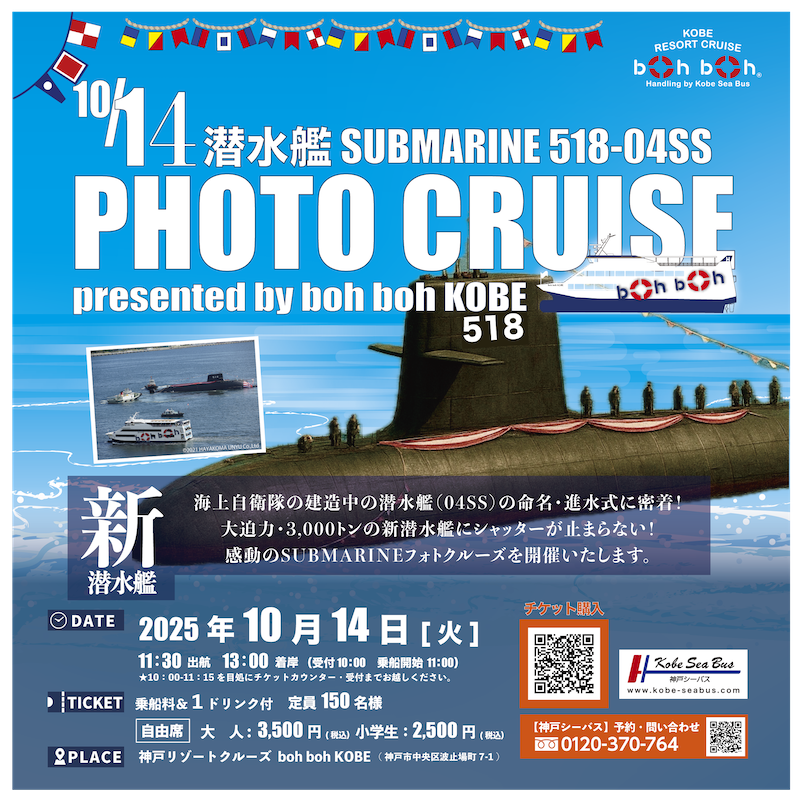神戸シーバスboh boh KOBEは、10月14日(火)に、迫力満点の海上自衛隊 潜水艦を間近で撮影できる、潜水艦「艦番号518-」命名・進水式 SUBMARINE 「PHOTO CRUISE」を開催いたします!! 川崎重工神戸工場で建造中の潜水艦【518-04SS】の命名・進水式の様子... -