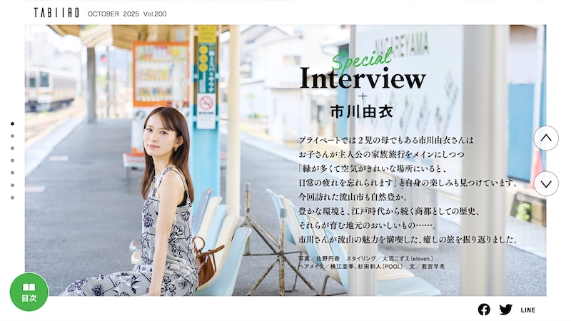 【発酵マイスターで人気料理家・榎本美沙さん考案の白みりんを使用したレシピも】 「月刊 旅色」10月号表紙:市川由衣さん 株式会社ブランジスタメディアは、表紙に市川由衣さんを迎え、千葉県 流山市と提携し、同市を特集した電子雑誌「月刊 旅色」2025年... -