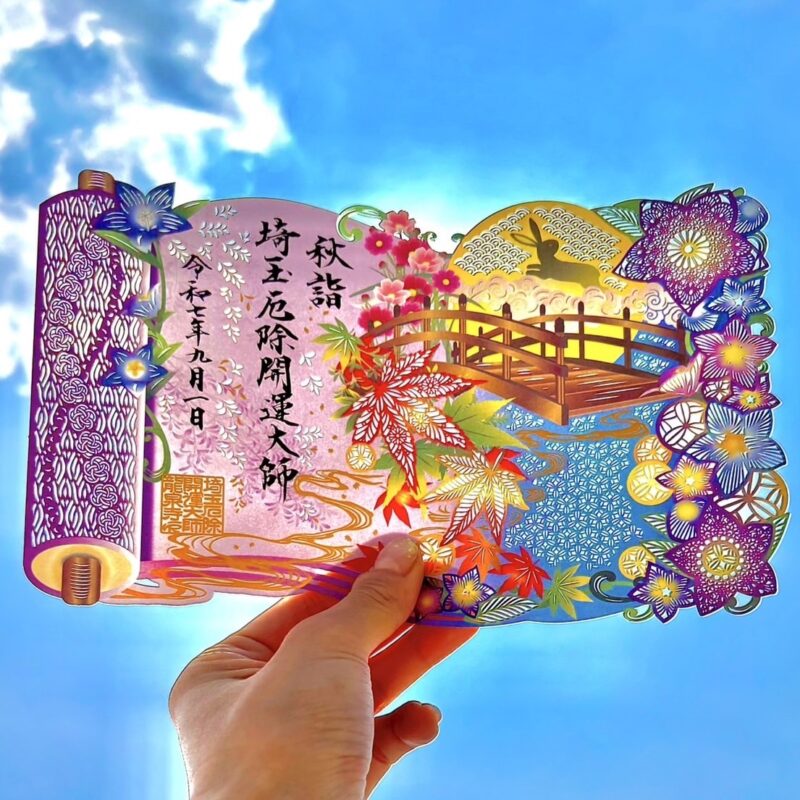 切り絵御朱印発祥の寺「埼玉厄除け開運大師・龍泉寺」にて2種類の秋限定重ね切り絵御朱印『秋の花舞う大師堂―百花繚乱ー』『秋詣 ―秋夜橋―』の授与開始