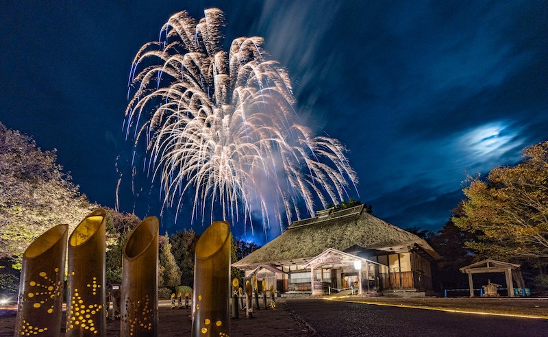 国営みちのく杜の湖畔公園(宮城県柴田郡川崎町)では、2025年10月31日(金)~11月3日(月祝)、7日(金)~9日(日)の計7日間、今年で3回目を迎えるライトアップイベント『みちのくふるさと秋灯り』を開催します。 古民家の後方に広がる打上げ花火(... -