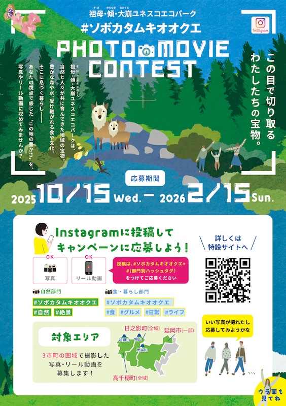 祖母・傾・大崩(そぼ・かたむき・おおくえ)ユネスコエコパークの宮崎エリア(延岡市、高千穂町、日之影町)を舞台にインスタグラムハッシュタグキャンペーンを開催します! 入賞者(合計55名様)には豪華賞品をプレゼント! さらに、入賞作品は今後... -