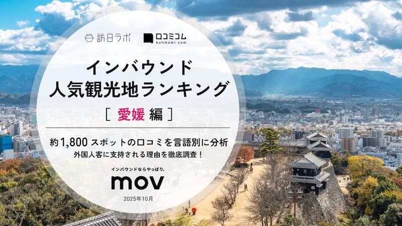 業界最大級のインバウンドビジネスメディア「訪日ラボ」及び 店舗向け集客一元化プラットフォーム「口コミコム」を運営する株式会社movは、愛媛県の観光地に寄せられた最新の口コミデータから、独自の『インバウンド人気観光地ランキング』を発表しました... -
