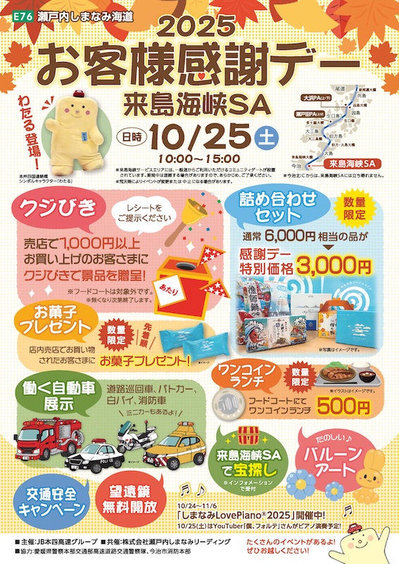 JB本四高速グル-プでは、瀬戸内の魅力を発見・発信することで、SA・PAを最大限活用する「せとうち魅力発見」キャンペーンを展開しています。 キャンペーンの一環として、このたび、日頃の感謝を込めて、E76西瀬戸自動車道(瀬戸内しまなみ海道)来島海... -