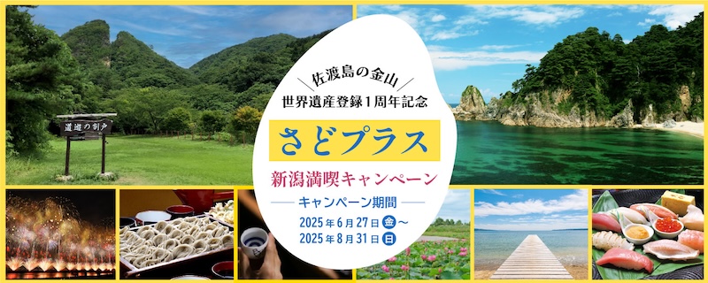 【あなたはいくつ集められる?グルメ・文化・自然が交差する夏の大冒険!スマホを片手に“新潟・佐渡”を満喫しよう!】 海を越えて繋がる2つのまち、新潟市と佐渡市。 2025年夏、「佐渡島の金山」の世界遺産登録1周年を記念して、この両エリアを舞台... -