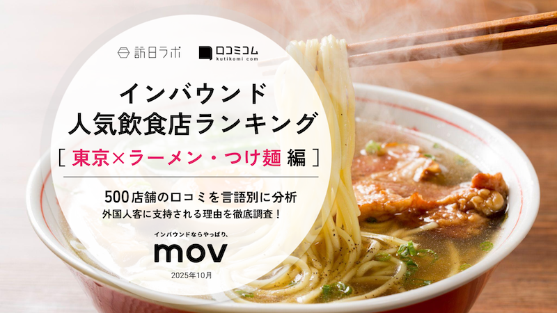 業界最大級のインバウンドビジネスメディア「訪日ラボ」及び 店舗向け集客一元化プラットフォーム「口コミコム」を運営する株式会社movは、東京都のラーメン・つけ麺店に寄せられた最新の口コミデータから、独自の『インバウンド人気飲食店ランキング』を... -