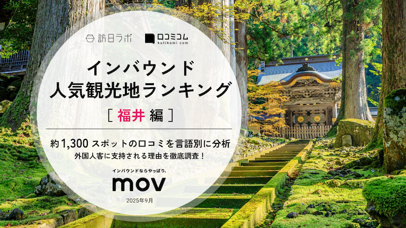 業界最大級のインバウンドビジネスメディア「訪日ラボ」及び 店舗向け集客一元化プラットフォーム「口コミコム」を運営する株式会社movは、福井県の観光地に寄せられた最新の口コミデータから、独自の『インバウンド人気観光地ランキング』を発表しました... -