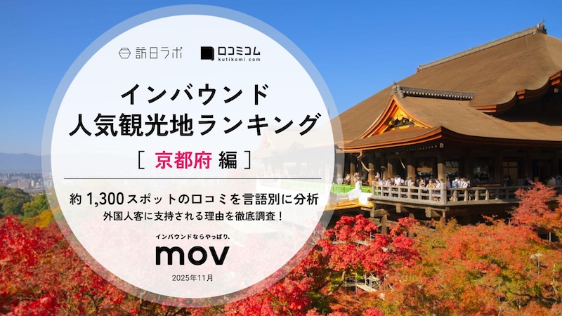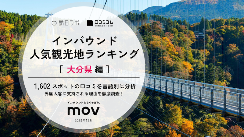 業界最大級のインバウンドビジネスメディア「訪日ラボ」及び 店舗向け集客一元化プラットフォーム「口コミコム」を運営する株式会社movは、大分県の観光地に寄せられた最新の口コミデータから、独自の『インバウンド人気観光地ランキング』を発表しました... ニュース